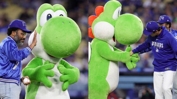 TV lica Donald Glover, Yoshi i Yoshinobu Yamamoto rekreirali Spider-Man meme na Dodger Stadiumu Specijalni trenutak tokom prve lopte povodom promocije filma 'Super Mario Galaxy Movie' 31. marta 2026. u Los Anđelesu tvApril 1, 2026