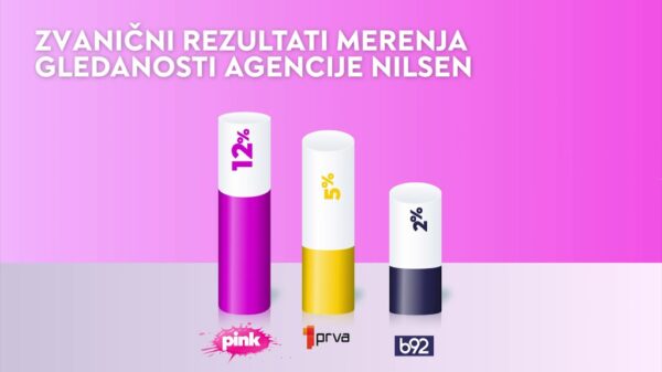TV Televizija Pink najgledanija tokom vikenda prema zvaničnim podacima agencije Nilsen Prema zvaničnim rezultatima merenja, komercijalni emiter ostvario je najveću gledanost u Srbiji tokom vikenda tvMarch 30, 2026